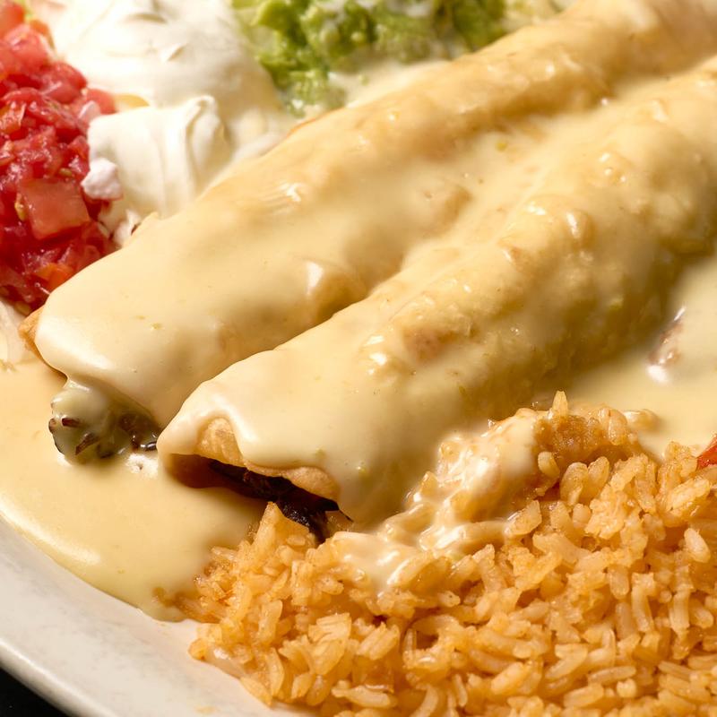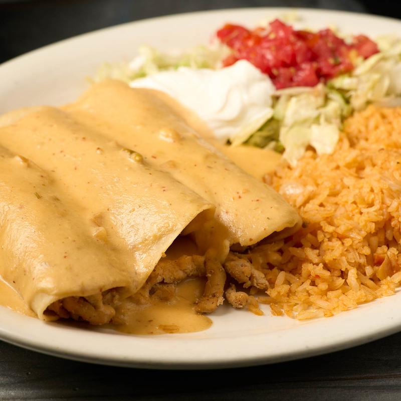Grilled Chicken $13.29 | Grilled Carnitas $13.29 | Grilled Steak $14.99 | Grilled Shrimp $15.29 | Ground Beef or Shredded Chicken (3) $9.99 • Your choice of meat, topped with creamy suiza sauce, and served with rice, lettuce, tomatoes and sour cream.