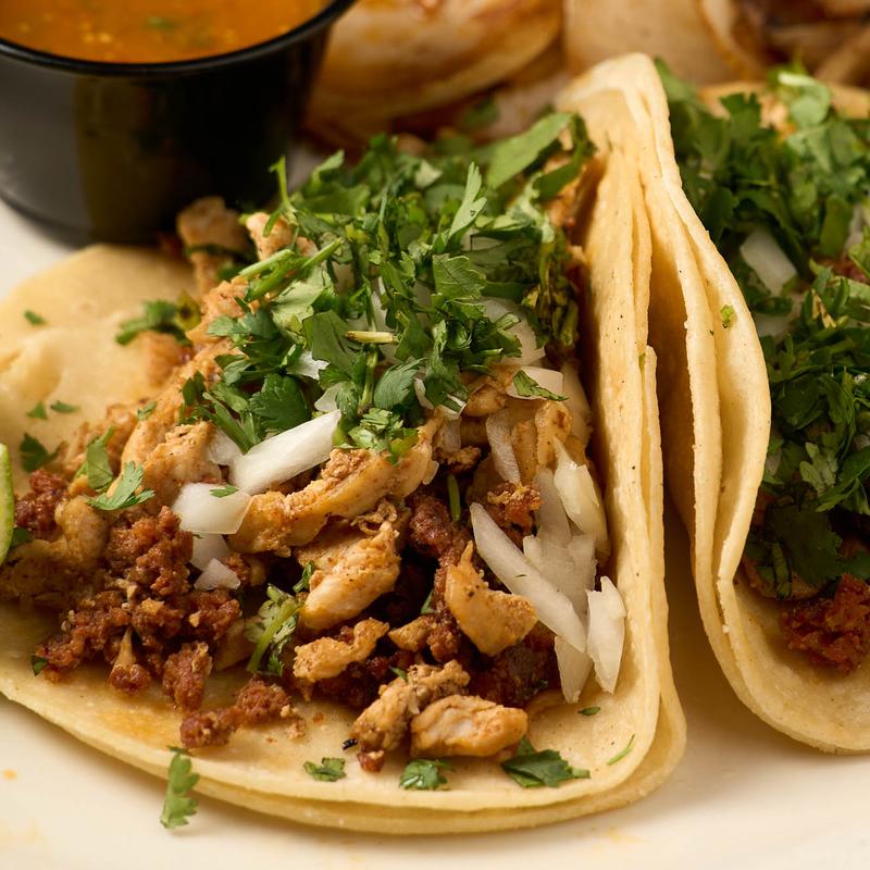 Three soft corn tortillas filled with grilled chicken and chorizo. Topped with fresh onions and cilantro. Served with side of cebollitas asadas.