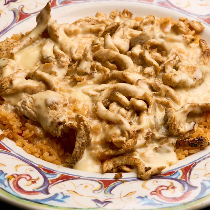 Grilled Carnitas $13.29 | Grilled Steak $14.99 | Grilled Shrimp $15.49 • Grilled chicken with rice, topped with our famous white cheese sauce. Served with three flour tortillas